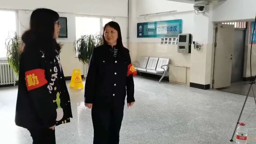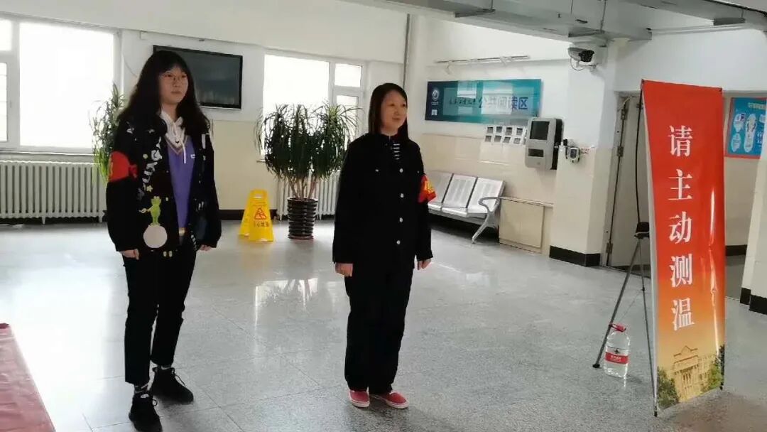 其中两位同学和宿管阿姨一起进行了寝室安全门的检查、监督同学们进出测温等工作。