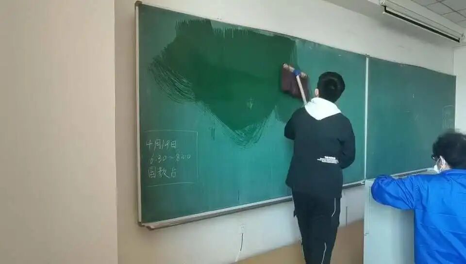 几位同学在教室清洁人员的带领下,擦黑板,打扫教室。
